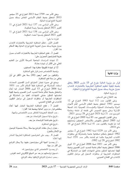 قرار وزيرة المالية يتعلق بفتح مناظرة خارجية بالاختبارات لانتداب عدول خزينة بسلك عدول الخزينة التابع للوزارة بعنوان سنة 2024.