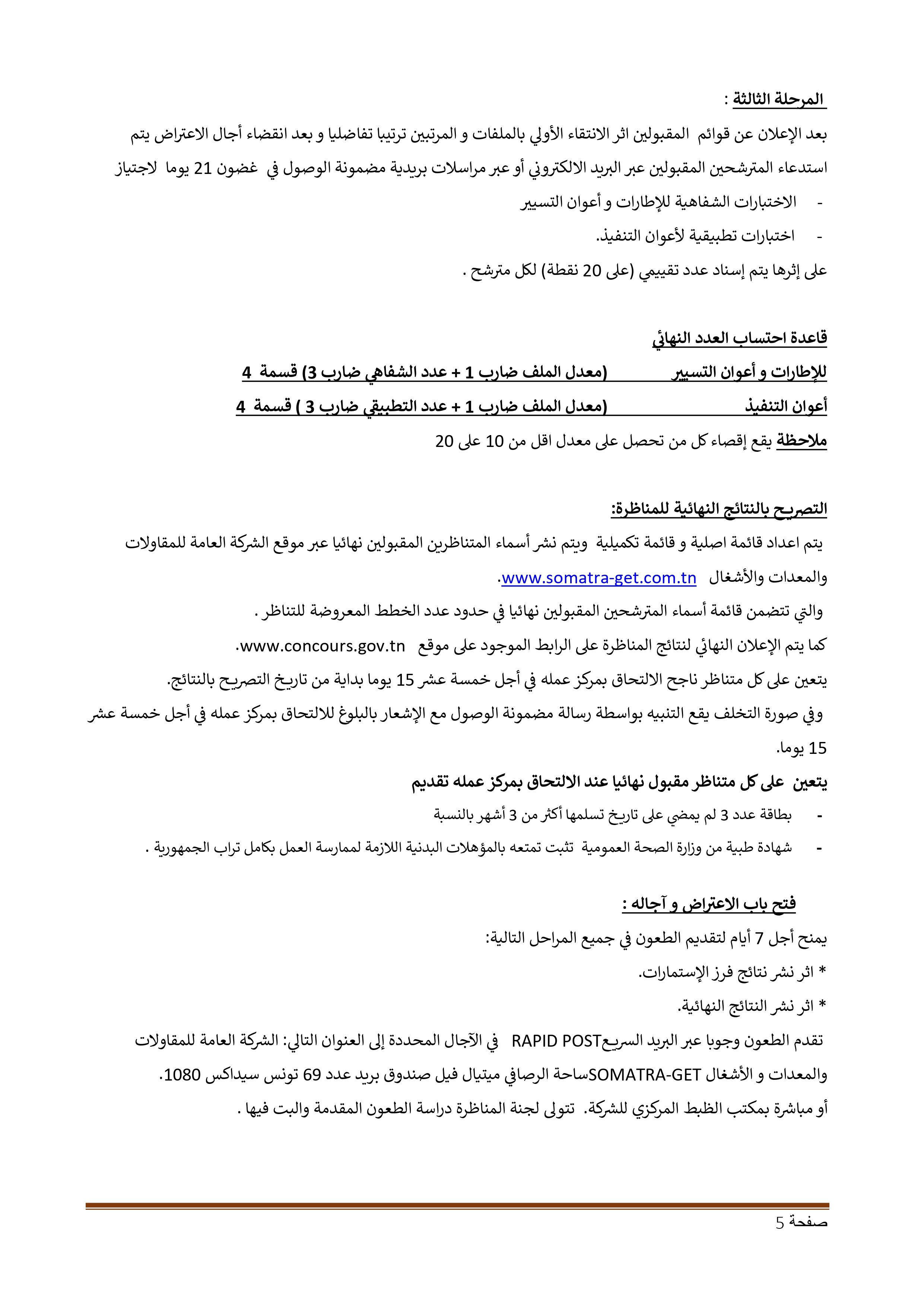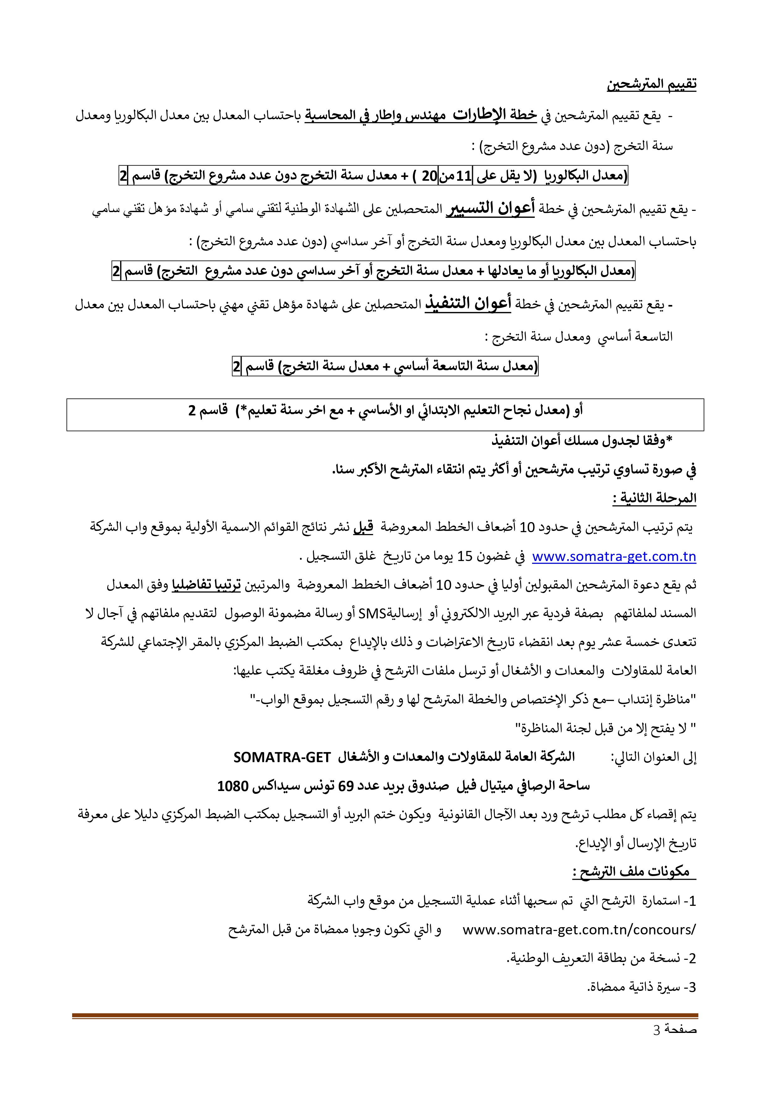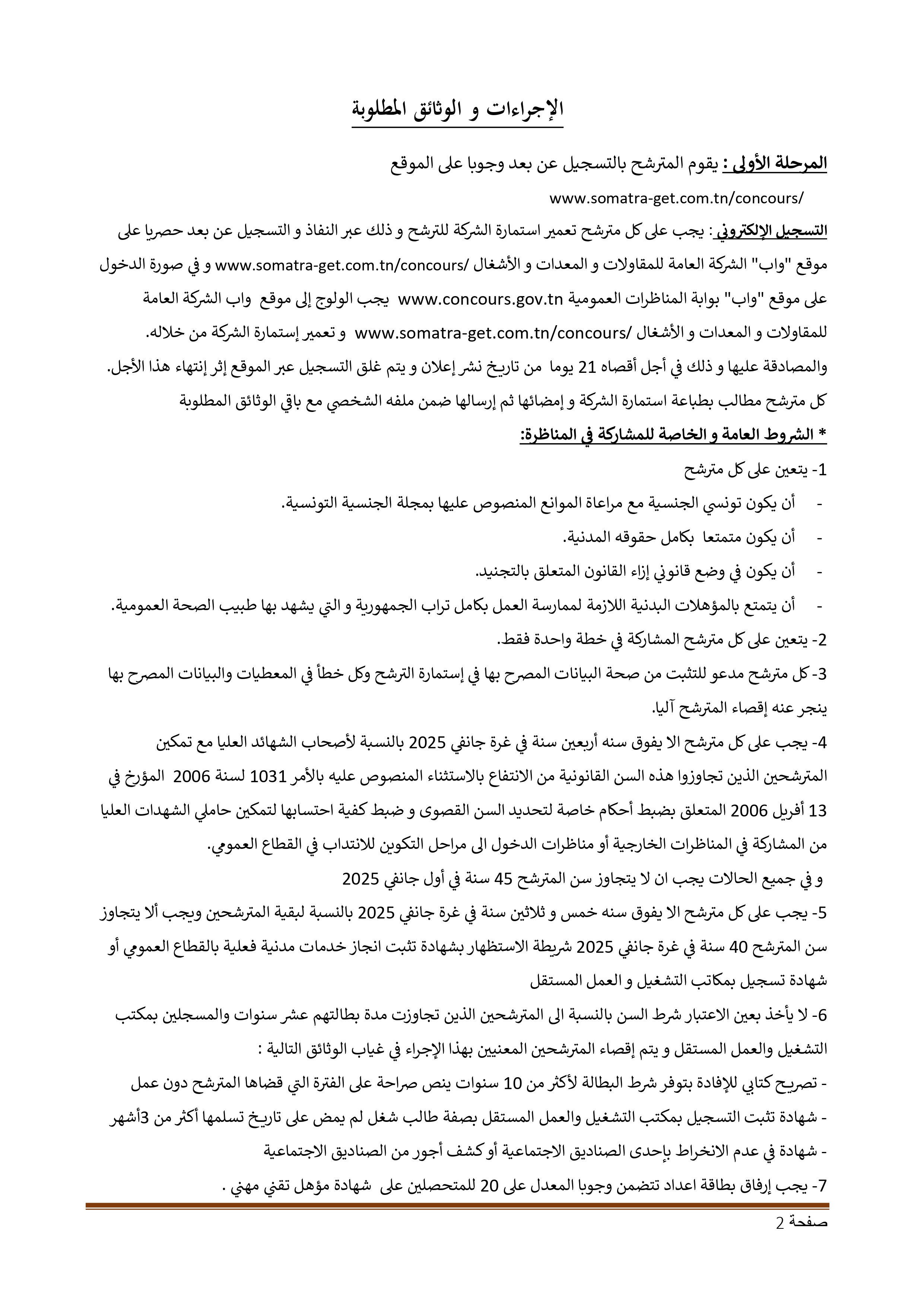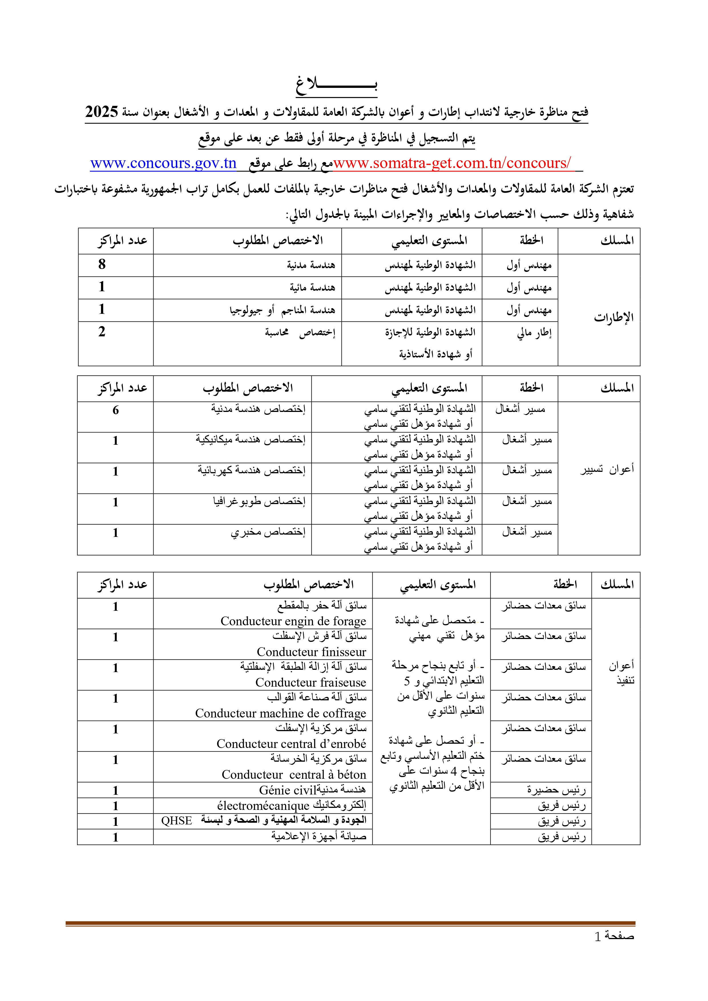 تعلن الشركة العامة للمقاولات والمعدات والأشغال (SOMATRA-GET) عن فتح مناظرات خارجية بعنوان سنة 2025 لانتداب إطارات وأعوان للعمل بكامل تراب الجمهورية.